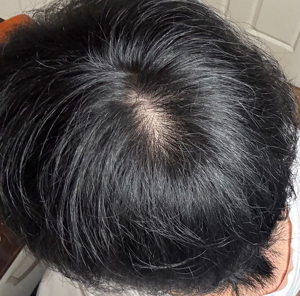 남성형 탈모에서는 보통 정수리 부위에서 점진적으로 모발 밀도가 감소하면서 두피 노출 범위가 점점 넓어지고, 주변 모발이 가늘어지는 특징이 동반됩니다. 현재 사진에서는 뚜렷한 모발 미세화나 넓게 퍼진 밀도 감소는 뚜렷하지 않아 초기 탈모로 보인다고 단정하기는 어렵습니다. 다만 사진 한 장만으로는 정확한 평가가 제한적입니다.