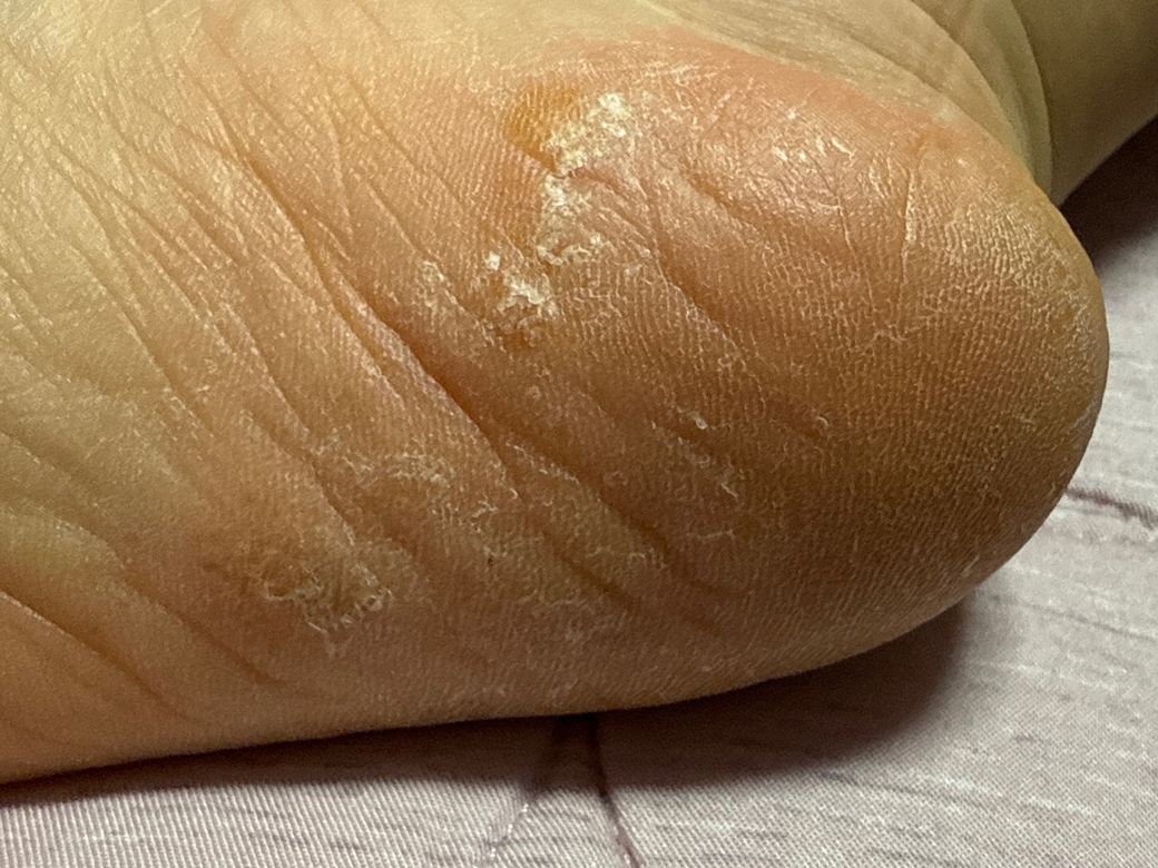 물론 직접 눈으로 확인하신 피부과 선생님이 더 정확하시겠지만, 사진상 발뒤꿈치 외측에 각질과 인설이 동반된 만성 병변으로도 보입니다. 수포성 병변은 뚜렷하지 않아 전형적 한포진보다는 제 의견으로는 만성 습진 또는 각화형 족부백선 가능성을 우선 고려해야 할 듯합니다. 특히 한쪽 발 위주로 반복되고, 스테로이드에 반응이 미미하거나 악화되는 느낌이 있다면 진균 감염을 반드시 배제해야 합니다.