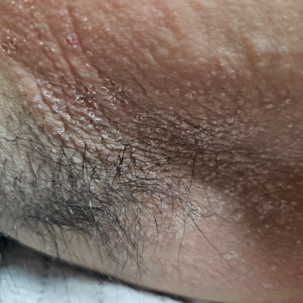 습진성 병변이 관찰되나 진균 감염증과 같은 요소에 대해서도 확인이 필요하겠으니 가까운 피부과를 방문해보시기 바랍니다.