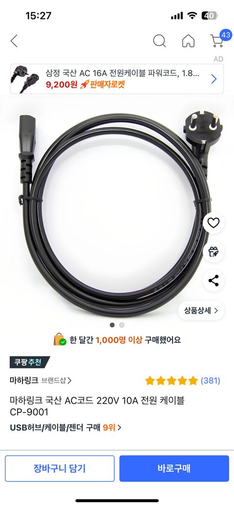 그냥 쿠팡에서 전원 케이블 찾다가 모양 비슷해 보이는거 골랐는데 저거 사면 되나요?3개의 답변이 있어요!