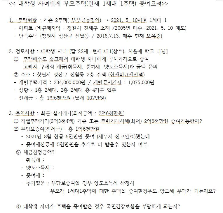 대학생자녀에게 주택증여시 세금문의