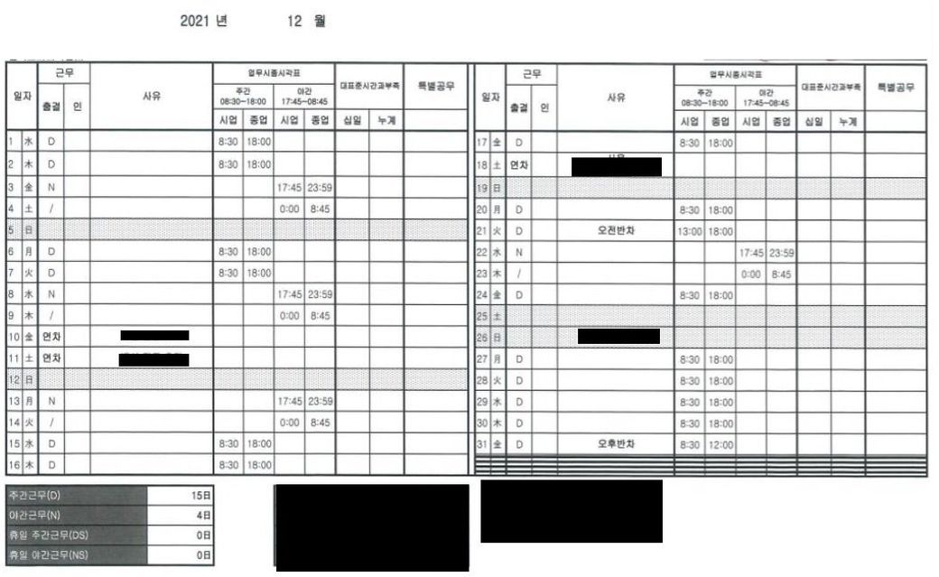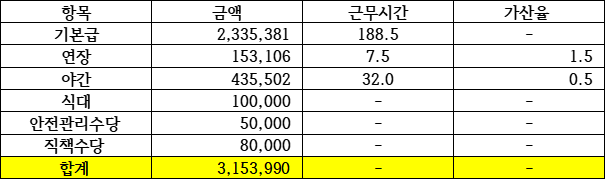 하기 스케줄 표를 보면 당사에서 파악한 근로시간은 노란 아래와 같습니다.