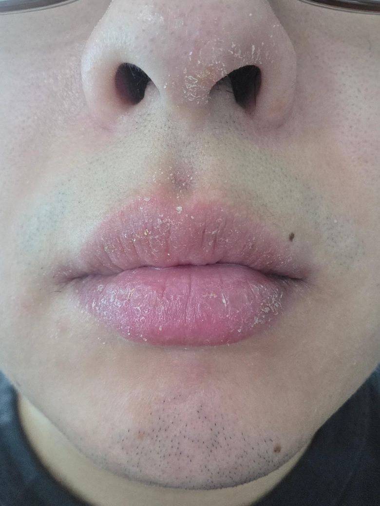 사진상 입술 전반과 입술 경계에 홍반, 미세 인설(각질), 경미한 부종이 보입니다. 코 끝의 인설도 동반되어 있습니다. 수년간 환절기에 반복된다면 단순 건조증보다는 만성 재발성 구순염의 가능성이 높습니다.