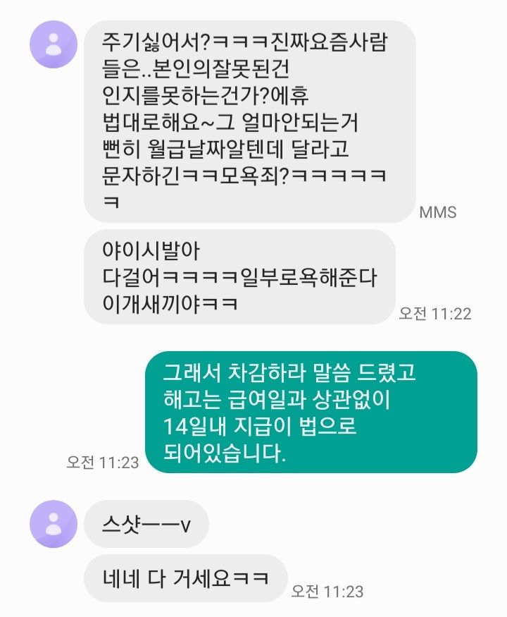 해당 내용은 근무지에서 사장님과 근로자인 저와의 대화로서 지금 올린 사진을 제외한 다른 사진에도 조롱이 섞인 언사가 있습니다.