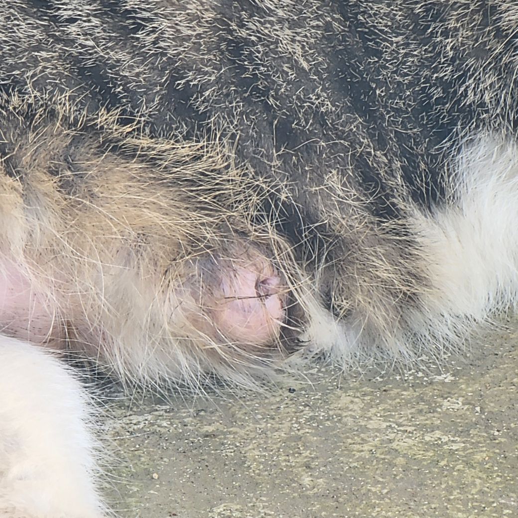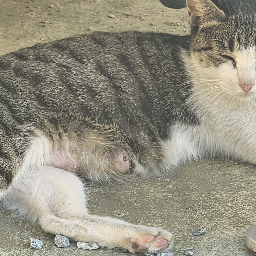 요즘 밥챙겨 주는 고양이가 있는데 오늘 보니 배에 이상한게 있습니다 젖꼭지는 아닌거 같고 혹, 곪은종양이거나, 그것도 아니면 진드기에 물리거나 한걸까요? 경계가 심한 아이라 이 사진이 최선이네요ㅠㅠ