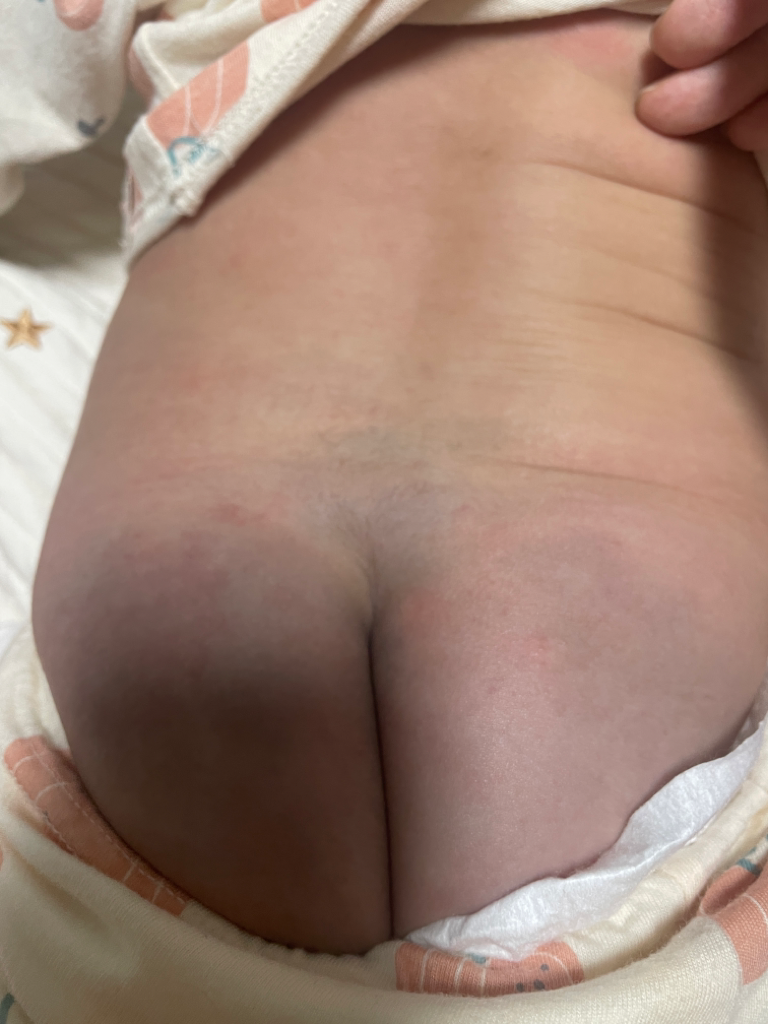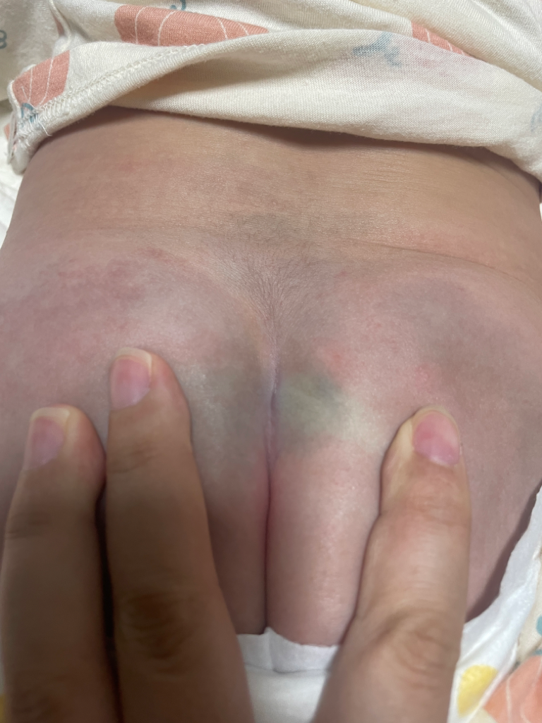 사진만으로는 명확하게 딤플이 의심되지는 않으나 사진으로는 한계가 있으니 소아과 내원하여 진료 권고드립니다. 딤플 중 깊거나 큰 경우(0.5 cm 이상), 항문으로부터 2.5 cm 이상 떨어진 경우나 털이 난 경우, 피부색 변화가 있는 경우 등에서 초음파 등 추가검사를 고려하는데 실제 신경학적 이상으로 진단되는 경우는 드무나 현재는 굉장히 광범위하게 스크리닝하는 추세입니다. 아이의 경우 보이는 사진 상으로 걱정할 정도의 털 양상은 아라도 생각되나 정확한 것은 영유아검진 또는 소아과 내원하여 진료 권고드립니다.
