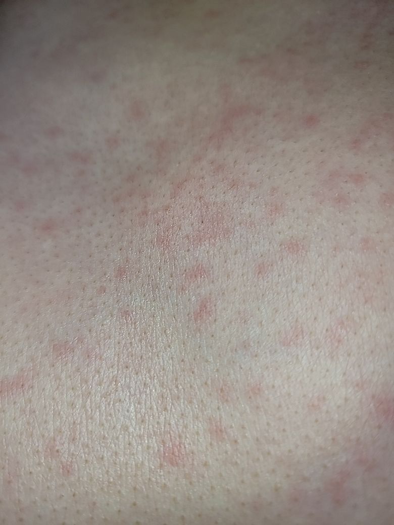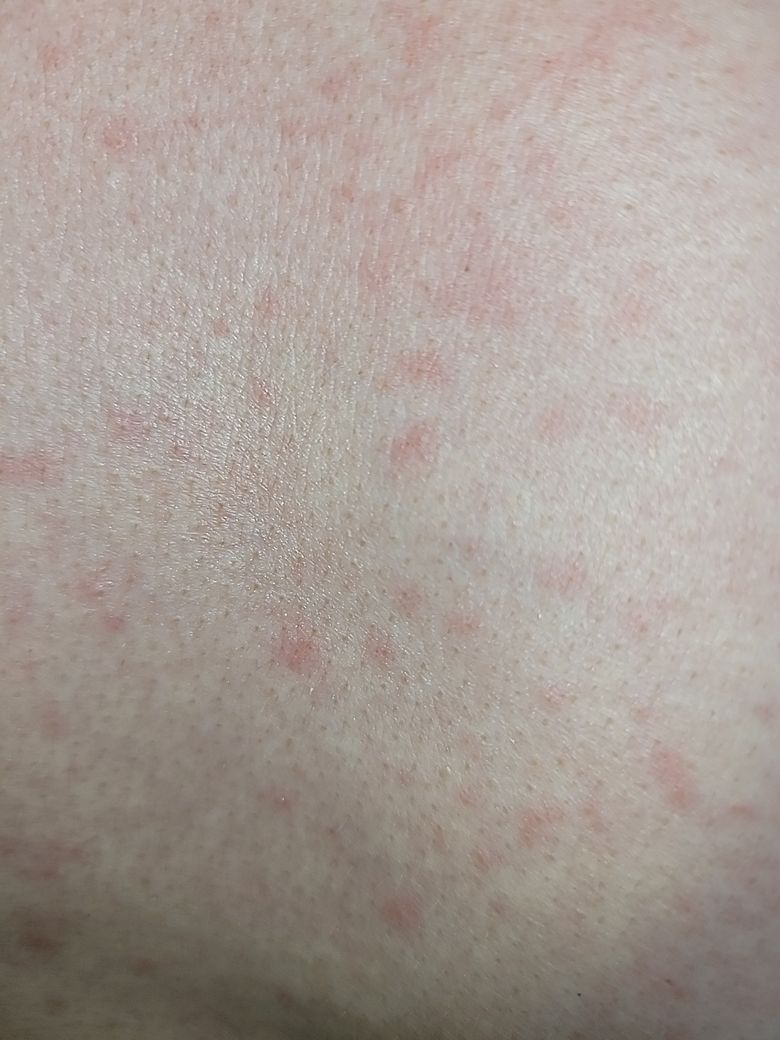 콜린성 두드러기, 알러지성 피부염, 접촉성 피부염 등의 가능성이 있어 보이나, 사진만으로는 정확한 진단이 불가능하기 때문에 상급병원 피부과 방문해보시는 것을 권유 드립니다.