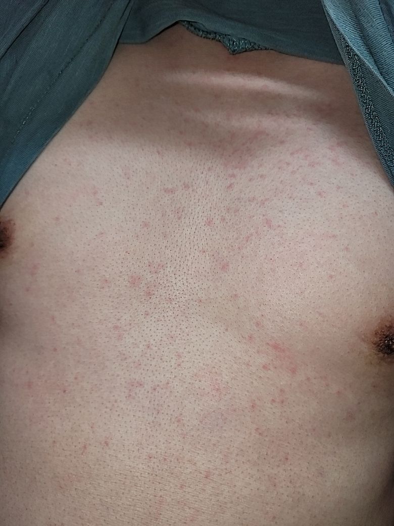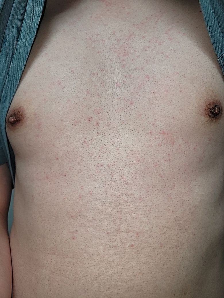 발병될 때 조건이 뜨거운곳이나 더운곳에 오래 노출되어 있거나, 운동을 하거나 긴장을 많이 해서 체온이 상승하고 땀을 흘리곤 하면 어김없이 가슴쪽 부터 빨갛게 나타나게 됩니다, 두드러기처럼 부풀어오르지는 않고 사진처럼 붉게 변하고, 나타나게되면 간지럽거나 따가운 느낌은 전혀 없고, 하룻밤 자고 나면 사라지고 없습니다, 병원에서 알러지성 피부염이라고만 이야기하고 항염증제와 항히스타민제를 줬었고, 항히스타민제만 복용할 땐 증상이 있었던 걸로 기억하는데 항염증제를 복용할땐 확실히 증상이 나타나지 않았습니다 . 약 복용중이 아닐 시에는 동일하게 증상이 나타나구요, 어떤종류의 피부질환일까요 증상이 나타나도 다음날이 되면 그냥 사라지니 병원을 갈 타이밍도 잡기가 쉽지가 않네요ㅜ 알레르기검사에서는 특별한 것이 없었습니다ㅜ