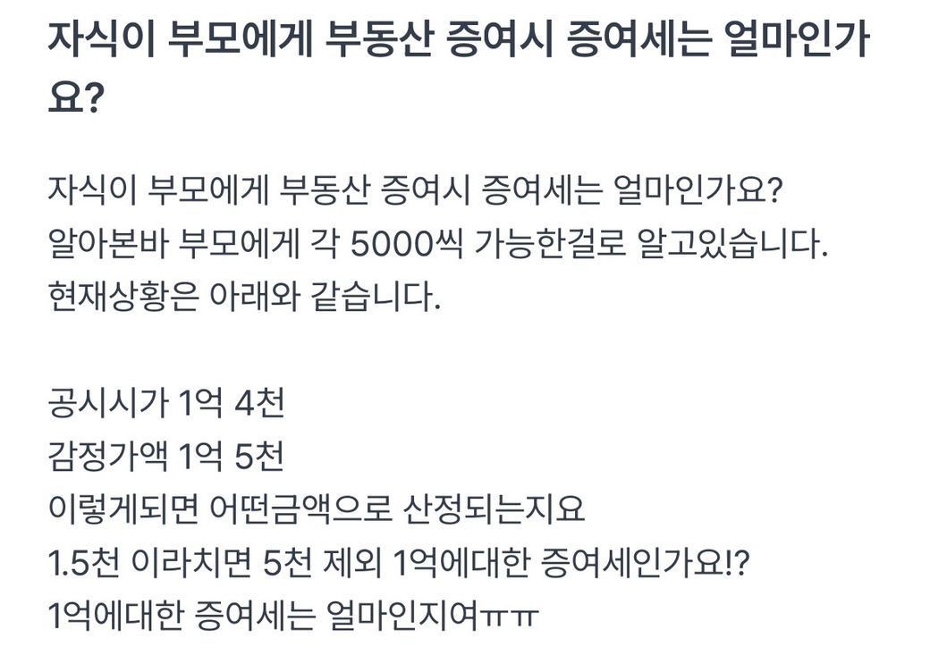 자식이부동산을 부모에게 증여시 증여세문의ㅜ