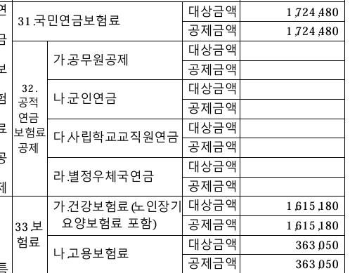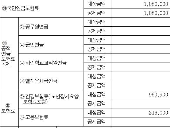 연말정산 근로소득원천징수영수증 대상금액과 공제금액