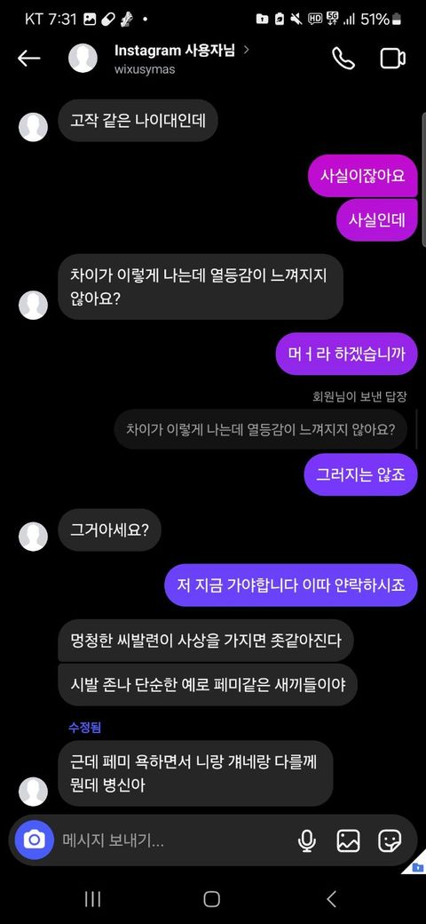 라고 보냈습니다 거기서 상대방이 화가났는지 욕을 더 하더라고요 저랑 여성 페미니스트 비교하는것 까지도 참았고 부모님 욕도 참았는데