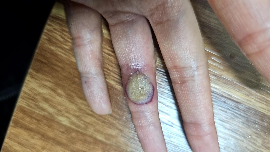 사진상 병변은 표면이 거칠고 각질이 두꺼우며 중심부가 딱딱하게 보이고, 주변으로 홍반이 있는 형태로 보입니다. 임상적으로는 보통 사마귀(인유두종바이러스 감염)에 합당한 소견입니다.