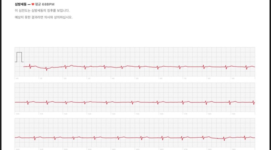 제공된 애플워치 단일유도 심전도를 기준으로 보면 평균 심박수는 약 68회 정도이며 전반적으로 R-R 간격이 비교적 규칙적으로 보입니다. 심방세동이라면 특징적으로 다음 소견이 나타나는 경우가 많습니다. 첫째, R-R 간격이 완전히 불규칙한 “irregularly irregular rhythm”. 둘째, 일정한 P파가 보이지 않음. 셋째, 기저선이 잔물결처럼 보이는 세동파. 첨부된 기록에서는 박동 간격이 대체로 일정하며 심방세동에서 보이는 전형적인 완전 불규칙 패턴은 뚜렷하지 않습니다. 단일유도 화면상으로는 정상 동율동 또는 간헐적 전도 지연 정도로 보이는 패턴에 더 가깝습니다.
