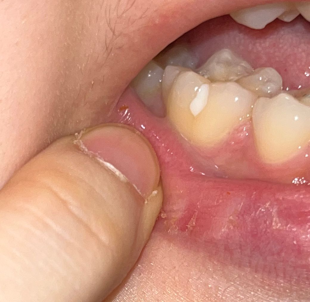 일단 병소의 크기가 작고 특이적이지는 않아서 잇몸에 자극이 가서 그럴 가능성이 높기 때문에 시간이 지나면 없어질 가능성이 높아보이는데요. 우선 너무 걱정하지마시고 해당부위 위생관리를 좀 신경써주면서 경과를 지켜보시다가 통증이 생기거나 병소의 범위가 넓어진다면 치과에 내원해보시면 될 것 같습니다. 추가적으로 구강내 연조직 질환은 안면통증구강내과에서 전문으로 봅니다.