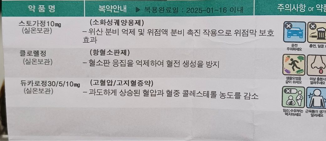 아빠가 내일 대장내시경을 하는데 아래와 같은 약을 복용하고 계세요. 월요일 병원 갔을때 이런약 먹고 있다 했는데 괜찮다고 했다는데 항혈소판제가 있어서 괜찮은건가 해서 물어봐요