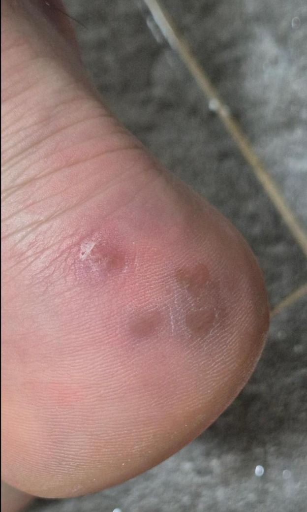 발 뒤꿈치가 얼룩덜룩해지고 누르면 통증이 심했고, 사진에는 안보이지만 까만색 점이 있었습니다.