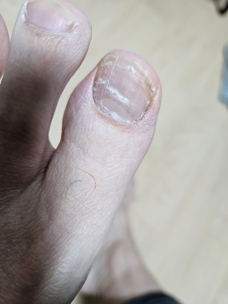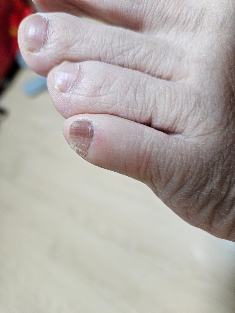 1.왼쪽 새끼 발톱이 검은띠가 있어서 흑색종 의심됩니다.