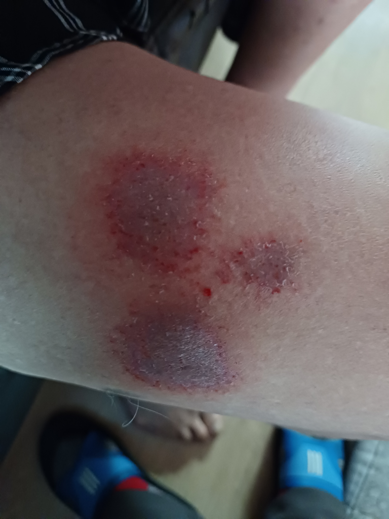 대상포진으로 보이지는 않습니다. 쓸려서 생긴 찰과상이거나 다른 피부염으로 인한 증상인 것으로 추정됩니다.