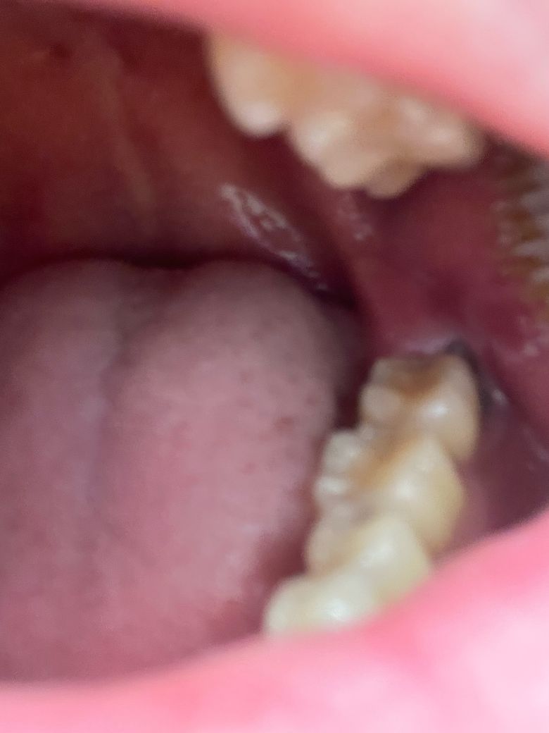 아래 어금니쪽 통증이 있어서 자세히 살펴보니 어금니 안쪽에 염증처럼 보이는 증상이 있습니다 사진과 같이 어금니 안쪽이 부어있고 검은색 가까운 색깔이 관찰됩니다 가만히 있어도 통증이 있고 불편하네요