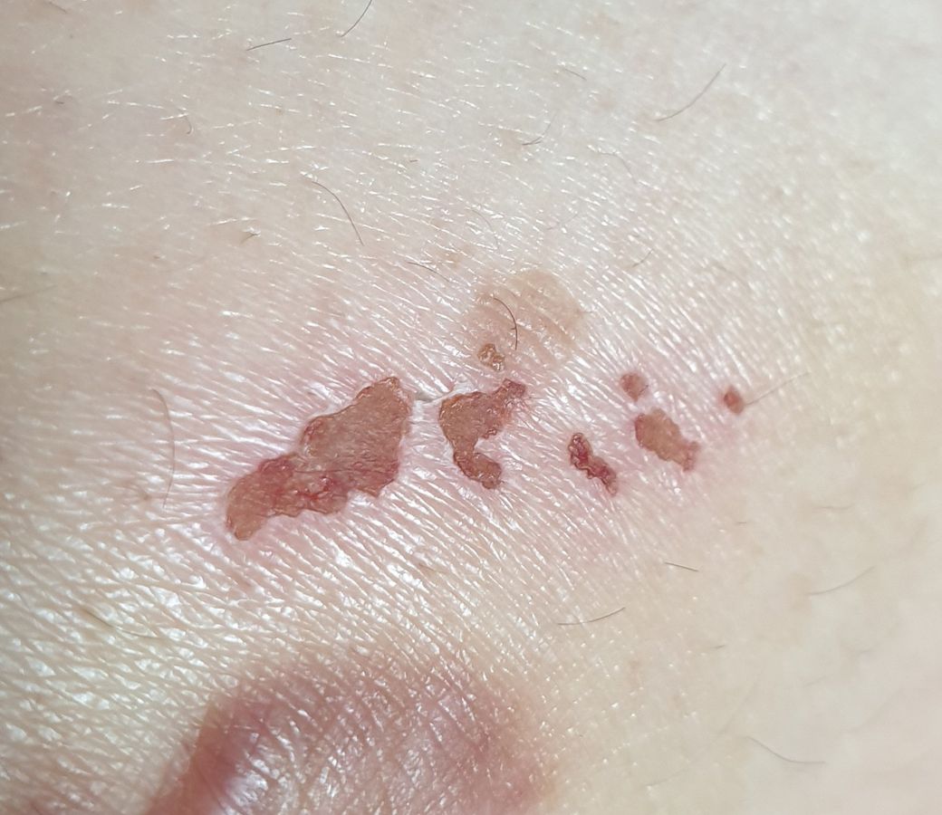 질문하신 내용에 대하여 아래와 같이 답변 드립니다.마찰에 의해서 피부에 손상이 생겼다면 사진과같은 상처가 생길수 있습니다.