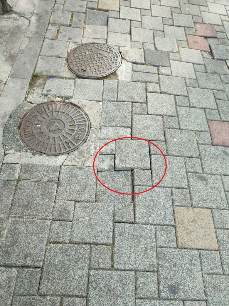 보도블럭이 깔린 인도위로 보행중 튀어나온 보도블럭에 그만 걸려 넘어지고 말았습니다.