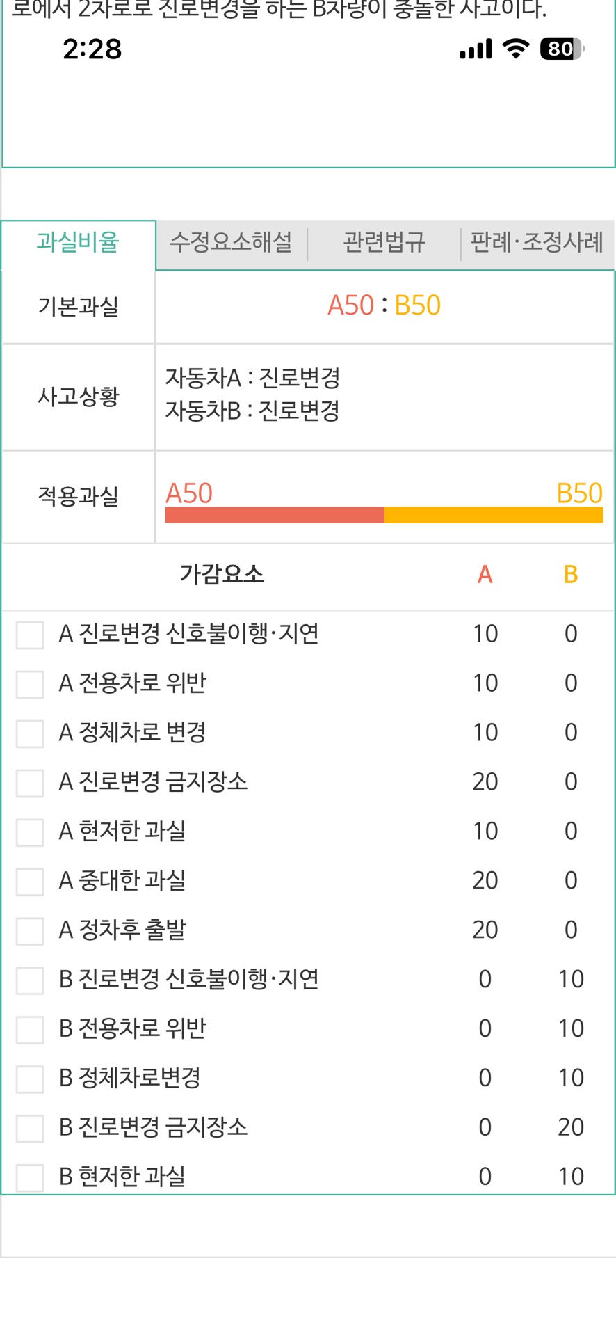 이경우 과실관계는 양차량이 모두 차선변경중사고이기 때문에 기본과실은 5:5에 해당이 되나,
