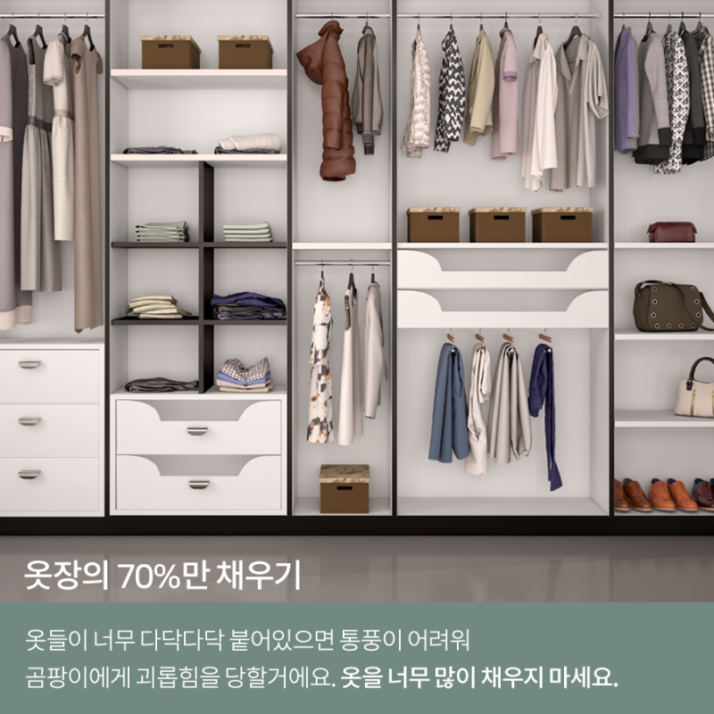 옷들이 너무 다닥다닥 붙어 있으면 통풍이 어려워 곰팡이의 괴롭힘을 당할 거예요.