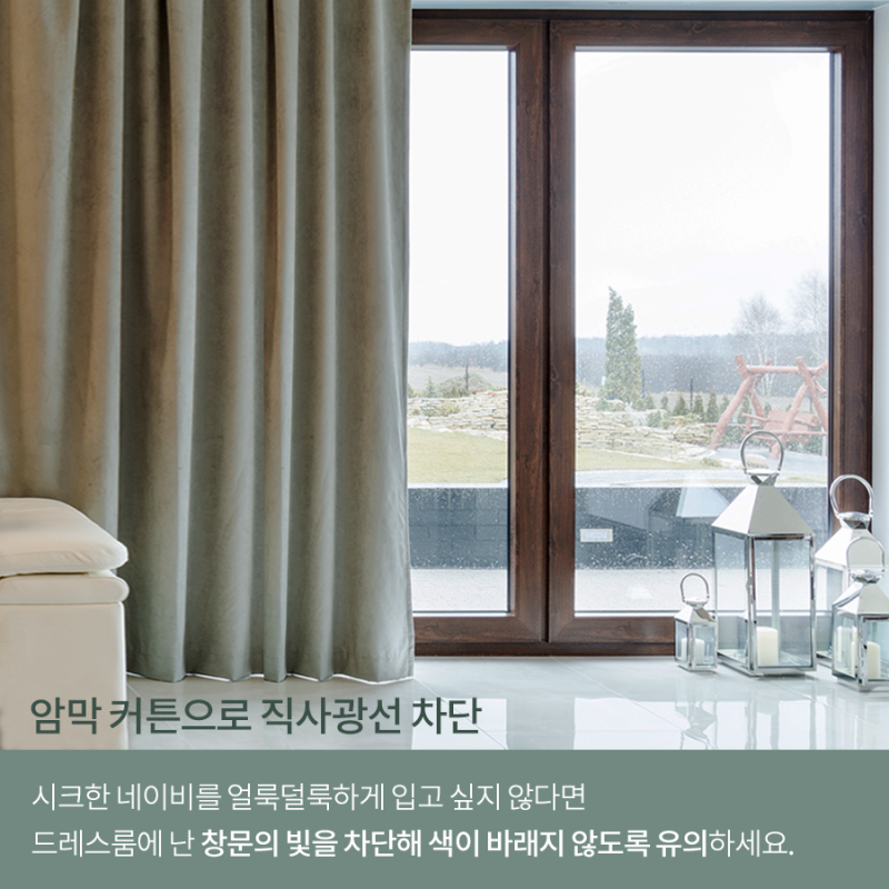 시크한 네이비를 얼룩덜룩하게 입고 싶지 않다면 드레스룸에 난 창문의 빛을 차단해 색이 바래지 않도록 유의하세요.