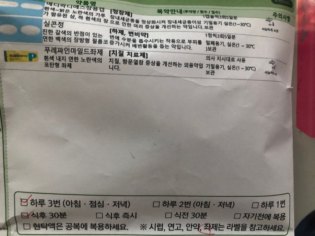1.이비인후과에서 처방받은 약(항생제 포함) 5가지랑 항문외과에서 처방받아온 실콘정을 식후 30분뒤에 먼저 먹어도 되는지? 아니면 이비인후과 약만 먼저먹고 항문외과 약 메디락디에스장용캡슐이랑 실콘정은 몇시간 뒤에 같이 먹어야 하나요?