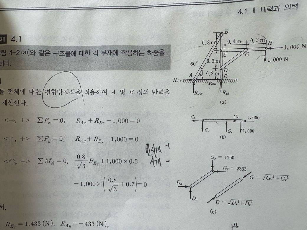 그림에서 모멘트 평형식을 적용하는 점은 보통 반력이나 지지를 받는 지점들입니다.문제에서 나온 E점 외에 모멘트 평형에 자주 사용하는 점은 A점과 E점 입니다.