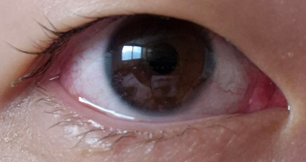 결막염으로 인한 충혈과 눈꼽의 가능성이 생각됩니다. 안과 진료와 약물치료가 필요할 것으로 생각됩니다.
