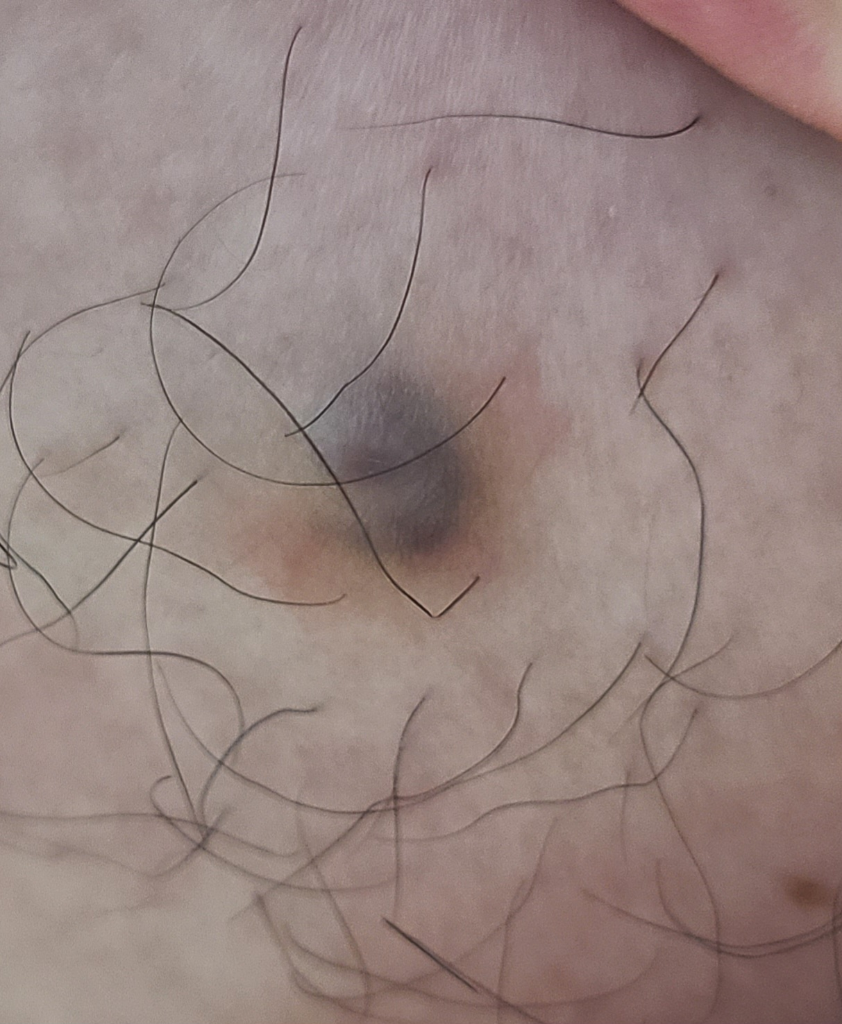 질문자님께서 올려 주신 사진상으로 보았을 때에는 단순 멍으로 발생한 혈종일 가능성이 있겠으나 만일 시간이 지나고도 증상이 완화되지 않는다면 간혹 피부암의 일종인 흑색종일 가능성이 매우 드물게 있을 수 있으므로 근처 피부과에 가셔서 의사의 진료를 받아 보시기를 권유 드립니다.