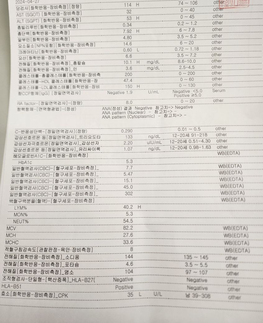 HLA-B51: Positive (베체트병과 관련이 있을 수 있음)