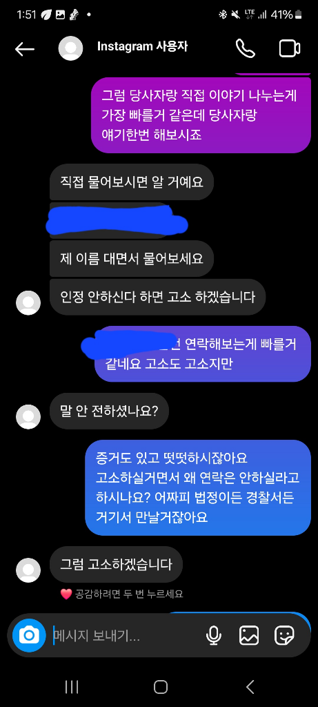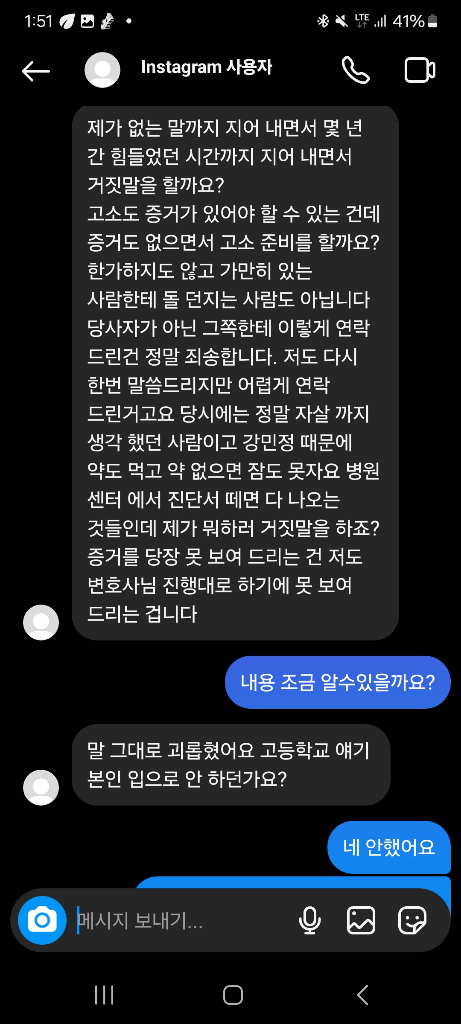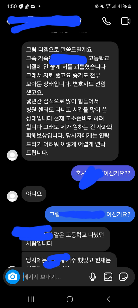며칠전 인스타그램 DM으로 과거 저희 와이프와 동창이라는 사람에게서 제 와이프가 과거에 자신에게 학폭을 해서 자퇴하고 지금도 정신적으로 힘들어 정신과 다닌다면서 진심어린 사과와 그에 관한 피해보상금? 뭐 돈을 달라는 식으로 이야기를 하고 자기는 지금 변호사를 고용해 고소를 할 예정이다 이러는데 저희 와이프는 그런적도 없고 이름만 알고 얼굴도 1번 2번밖에 못본 사람이라고 자기는 정말 그런적 없다고 하는고 지금은 스트레스 때문에 우울증 비슷한 현상이고 정신과 상담 받아보고 싶다고 하는데 지금 한달째 고소장 접수는 없고 와이프는 계속 힘들어만 하고 저희가 이사람 고소할 방법은 없을까요? 진짜 저도 와이프 너무 우울해 하는게 너무 신경쓰이고 너무 힘드네요 대화내용 캡쳐한거 보시고 정확한 답변 주시면 감사드리겠습니다. 아래 내용은 이름이랑 지역 때문에 지웠습지다. 읽어주셔서 감사합니다.