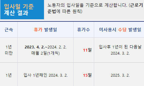 입사일 기준 계산 시 2023년 3월 2일 ~ 2024년 2월까지 사용 할 수 있는 연차 개수는 11개이며