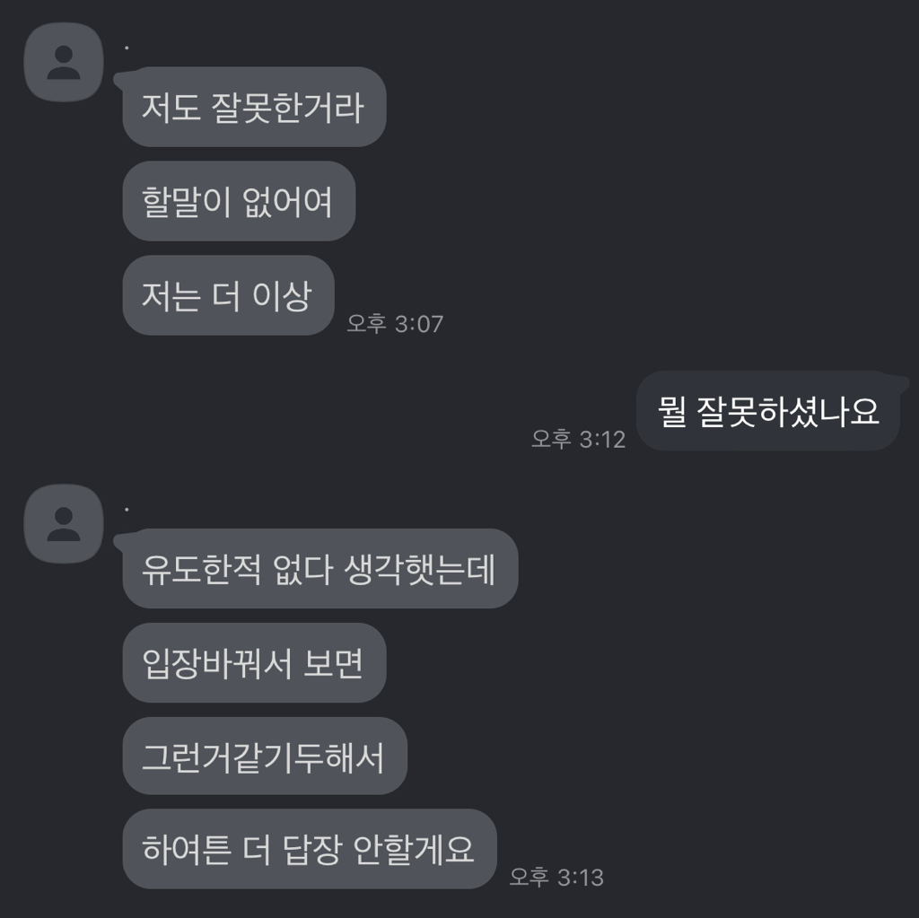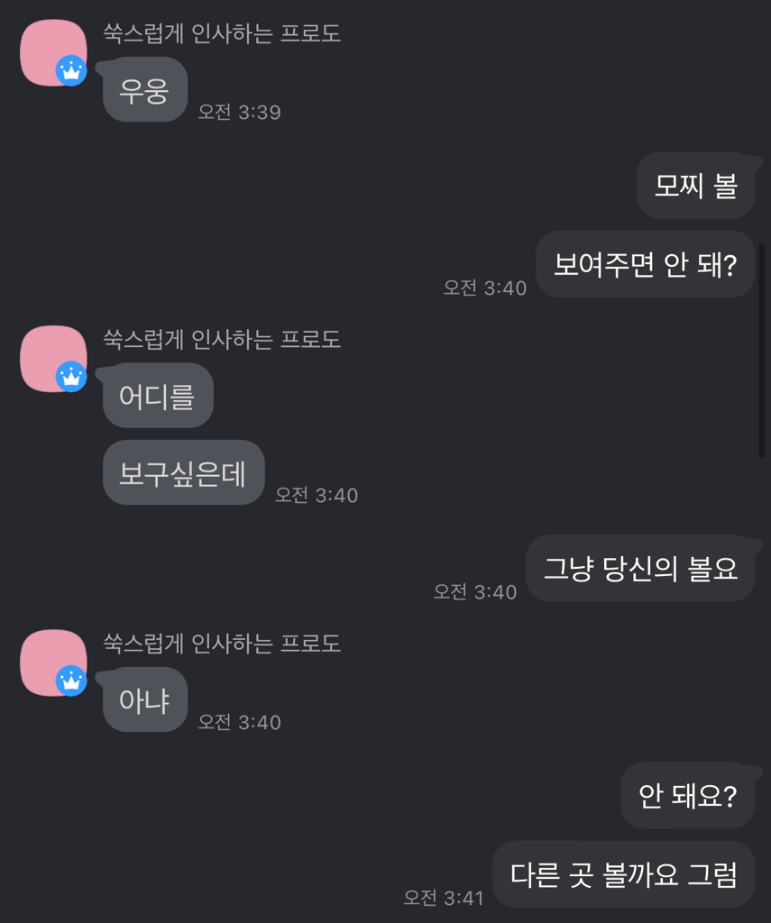 이후 카카오톡 프로필을 받아 카톡을 하니 고소를 하겠다며 제 실명이 들어간 ECRM 캡쳐본을 저에게 보내며 '사과 안 쳐하냐'는 말을 했고 저는 상대가 거절의사를 드러내지 않고 추가 질문으로 답변을 유도했단 점을 말하며 사과하지 않았습니다.