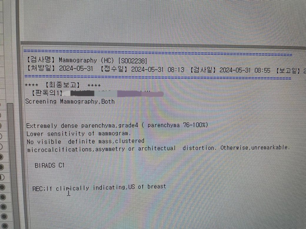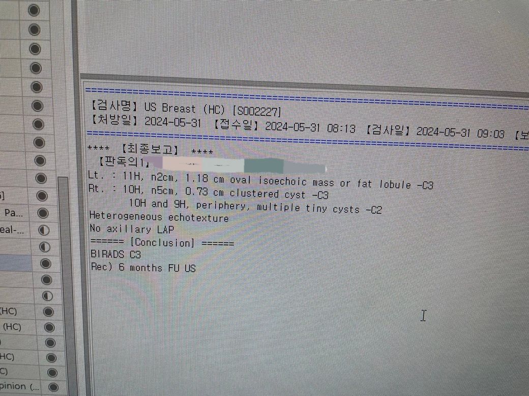 이런저런 내용이 적혀있는데 결과적으로 말씀드리면 BIRADS 카테고리만 보면 됩니다. 첫번째 사진은 카테고리 1로 음성 소견, 즉, 아무런 문제가 없다는 이야기입니다. 두번째 사진은 카테고리 3으로 결절 같아 보이는 종물이 있지만 양성일 가능성이 높아 추적관찰으로 충분하다는 소견입니다.