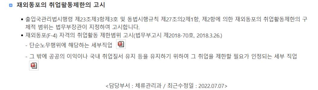 [하이코리아] 재외동포(F-4) 체류자격 소지자가 국내거소신고를 하면 단순노무 행위, 선량한 풍속이나 그 밖의 사회질서에 반하는 행위, 법무부장관이 공공의 이익이나 국내 취업질서 등의 유지를 위하여 제한할 필요가 있다고 인정하는 경우를 제외하고 국내에서 취업활동이 자유롭게 허용됩니다.
