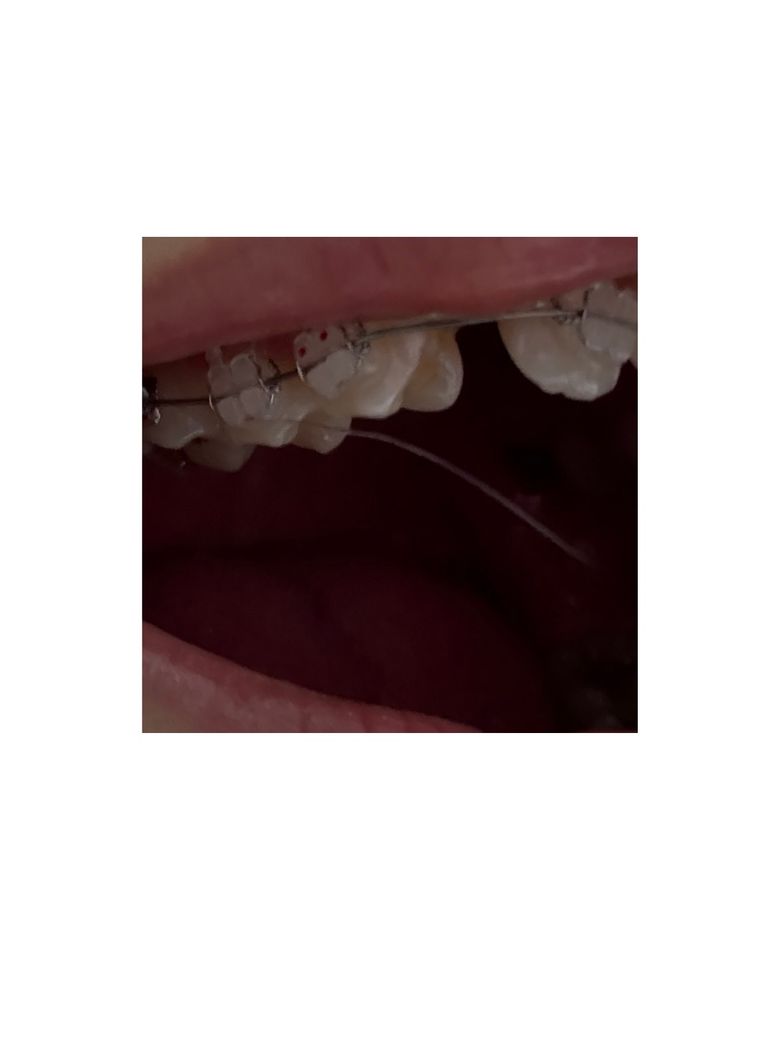 사진으로 보이는 것은 교정용 고무줄입니다. 교정용 고무줄은 치아에 힘을 작용해서 치아를 이동하게 하는 역할을 합니다. 가끔 이런 고무줄이 풀리게 되어 사진처럼 보이는 경우가 있습니다. 교정치과에서 진료를 받고 고무줄을 다시 결찰해 주는 것이 좋습니다.