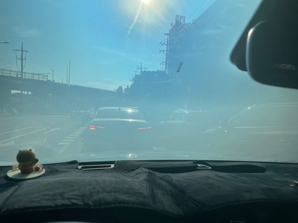 밖은 매우 맑은 날씨였고 직사광선이 바로 비추는 상태였지요. 전에도 살짝 비슷한 상황이 있었으나 오후가 되면 다시 정상이 되었습니다. 어두운데나 흐린날은 유리가 정상적으로 보였고 오전 아침 출근시간대인 7시에서 8시 사이에 차를 타면 가끔씩 저런 상황이 나왔습니다. 특이한건 우측상에는 안보이지만 투명 주차증 스티커 붙인곳은 멀쩡히 잘보인다는 겁니다. 다음날 비슷한 시간대에 다시차로 가보니 이번엔 정상이었습니다.