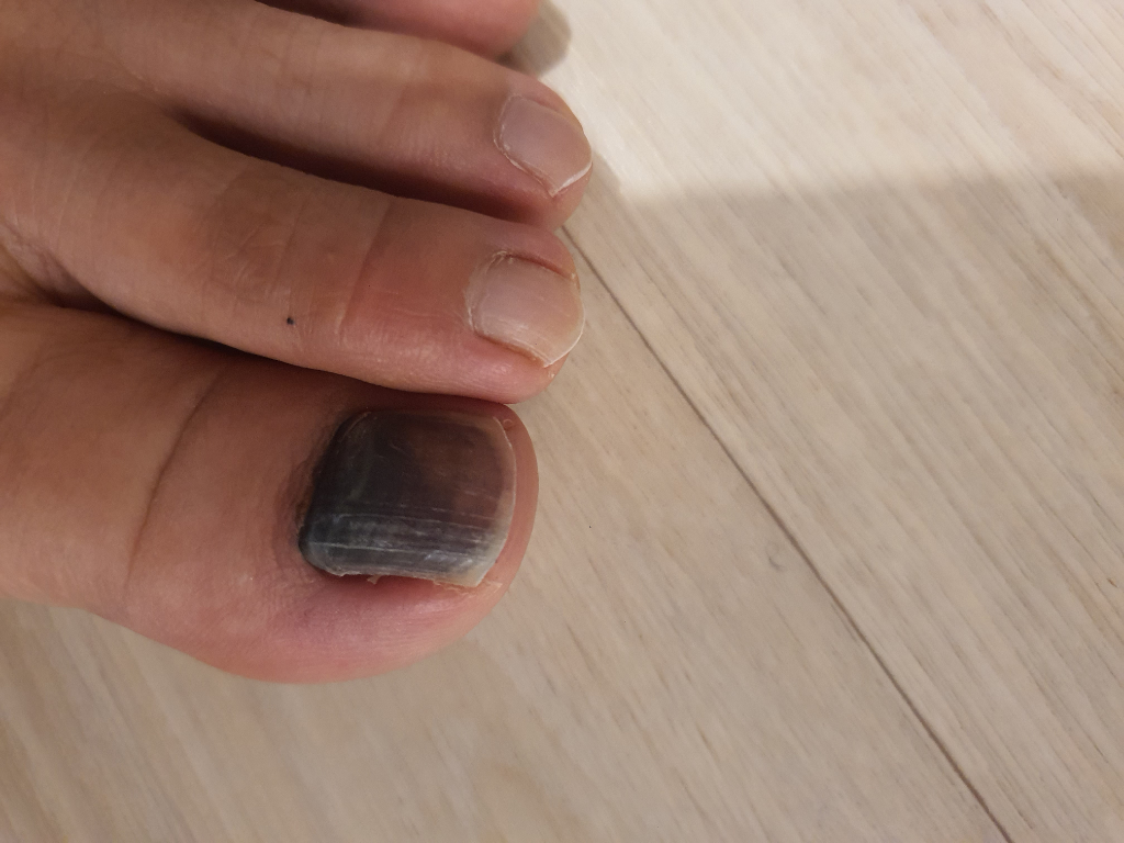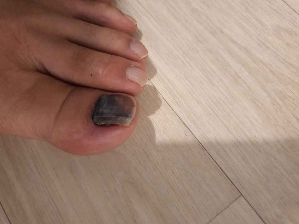 발가락 안쪽으로 출혈이 발생하면서 말 그대로 피멍이 든 상태를 의미합니다.