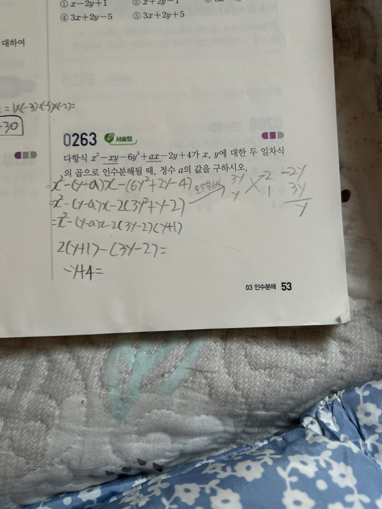다항식 x^2-xy-6y^2+ax-2y+4가 x,y에 대한 두 일차식의 곱으로 인수분해 될때 정수a의 값을 구하시오. 숙제인데 영안풀리네요... 부탁드려요...