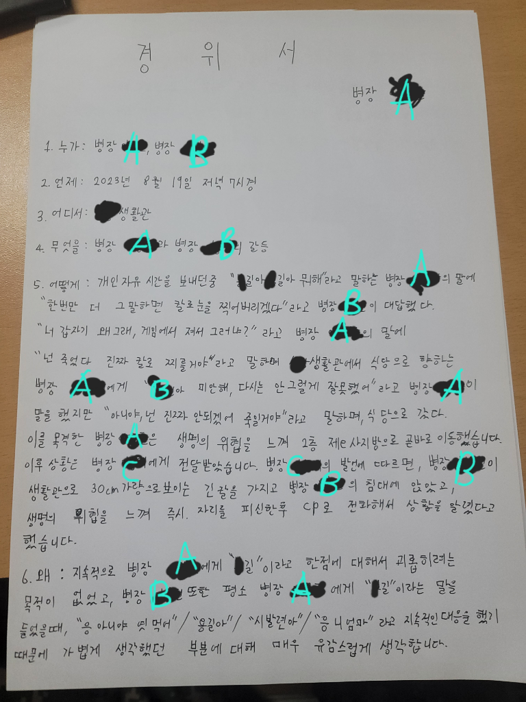 그러다가 23.8.19 저녁 7시경 이전때와 마찬가지로 A는 별명으로 불렀으나 B가 칼로 찔러 죽여버리기전에 그만해 라고했으나, A는 "왜그래, 온라인 게임하다가 져서 그러니"라고 말했다니 B는 "넌 진짜 죽일거야"라며 식당에서 칼을 가지러 가서 A는 B에게 "미안하다. 앞으로 다시는 안그럴게"라고 식당으로 가는 B에게 말했으나 "아니야 넌 진짜 안되겠어죽일거야"라고 말하며, 식당으로 향했고, 생명의 위협을 느낀 A는 즉시 다른 장소로 피신했고 B는 생활관으로 칼(30CM이상 사시미종류의 칼)을 소지한채로 본인 침상위에 앉아있었고 같은 생활관에 있던 다른 후임병이 이를 목격한후 바로 생활관에서 나와 상황실에 보고했습니다. 이후 헌병이 출동하여 상황은 종료되었으나 B는 간부님께 평소A에게 지속적으로 괴롭힘을 당했으며,신고의사가 있다고 말한상태입니다. 이에 대해 전 저렇게 썼으며 아직 제출하진 않았으나 내일 날이 밝는 대로 제출해야만합니다.