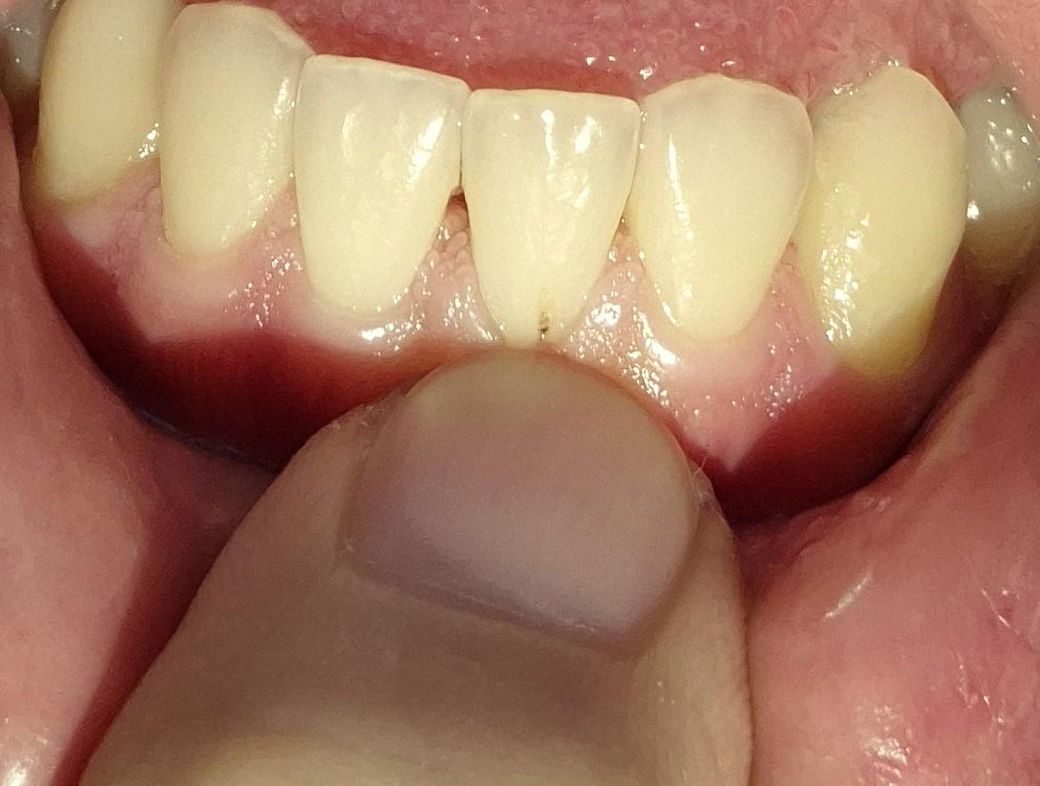 41번(41번 맞나요..?)치아 아래쪽에 사진처럼 검정 점이 보여서 잇몸 살짝 내려보니까 사진과 같은 상태인데 만져보니까 움푹 패여서 저 부분이 깨진 것 같기도 하구요 최근 치과 방문이 1달 전인데 그때는 없었던 것 같고 근 1주 이내에 생긴 것 같은데 충치일까요..? 아니면 그냥 놔둬도 될까요? 만약 치료한다면 레진이나 지아이 선에서 끝낼 수 있는지 아니면 심각한 건지 궁금합니다..