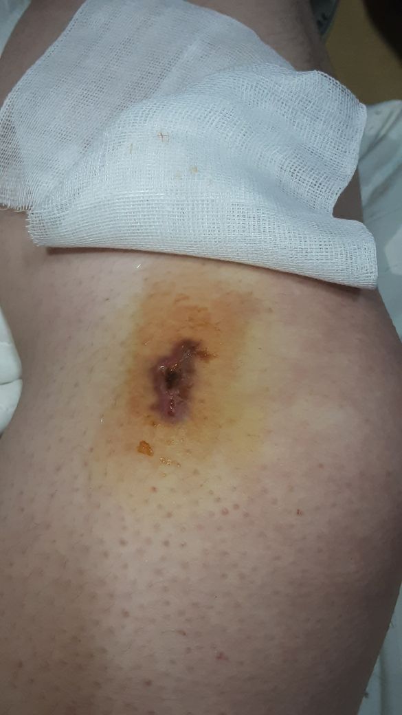 무릎부분 대퇴사두근 끝쪽 맞물린 두 근육이 2cm의 폭, 깊이 4-5cm 가량 유리조각에 의해 찢어졌습니다.
