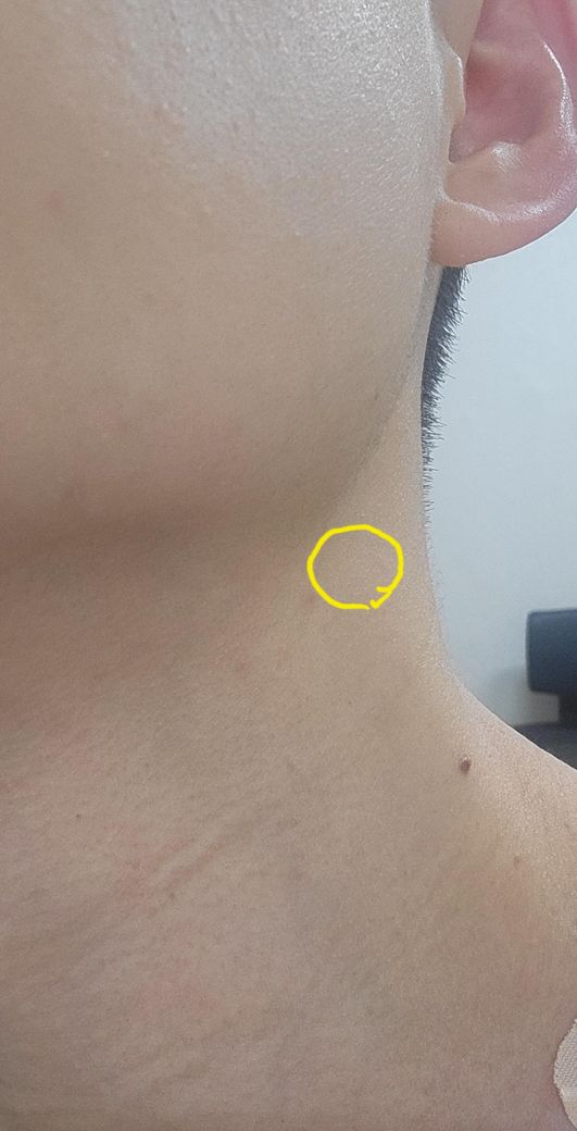 표시한 저 부위를 눌러보면 콩알만한 것이 만져진지 한달 정도 되었습니다.통증도 없고 열도 없고 다른증상은 없습니다. 이비인후과를 방문해서 한달중 2주는 약물을 복용해봤는데 똑같아서 초음파를 보았습니다.