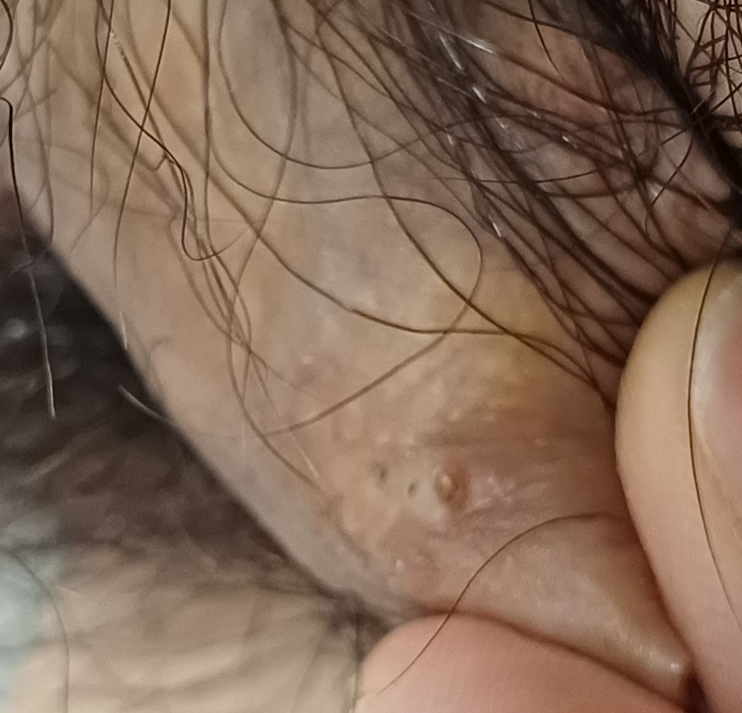사진에 보시면 저런게 생겼는데 아프거나 간지럽지는 않고 만지면 오돌한게잡혀요 이게 뭔지 알수있을까요? 제거가 필요한지도 알고싶습니다