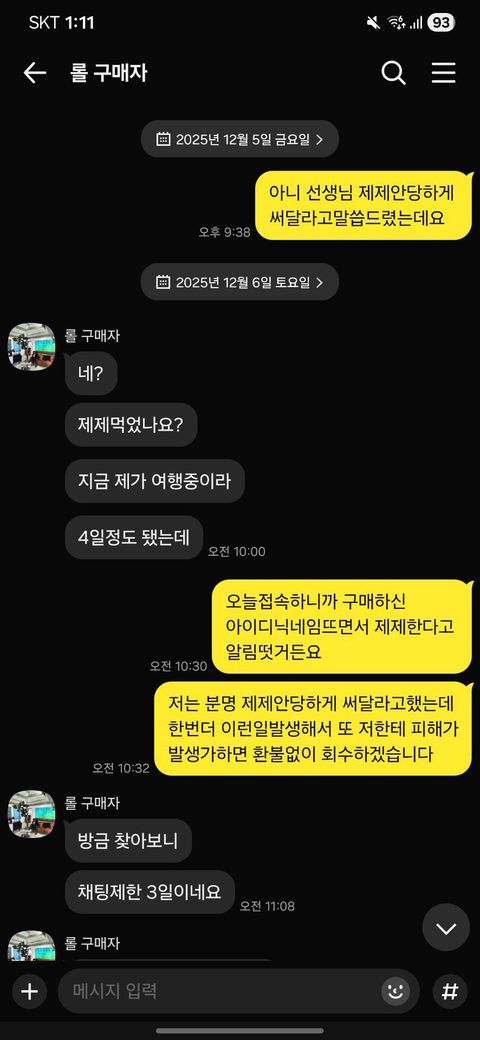 아이디 구매한지 몇일이 지나고 판매한 아이디가 재제를 당해서 저의 다른아이디도 피해를 입어서 구매자한테 카톡으로 연락해 재제안당하게 써달라 말씀드렸는데요 저도 피해를 보니 한번더 재제를 받을시 환불없이 화수하겠다고 말했습니다 그래서 구매자는 회수해간다는 말해 네~라고 답장해서 저는 동의로 알고 얘기끝나고 바로 어제 저녁에 게임을 들어가니 또 펀매한 아이디가 재제를 먹어서 저의 다른 아이디들이 이용제한 3일을 받아서 저번에 말한것처럼