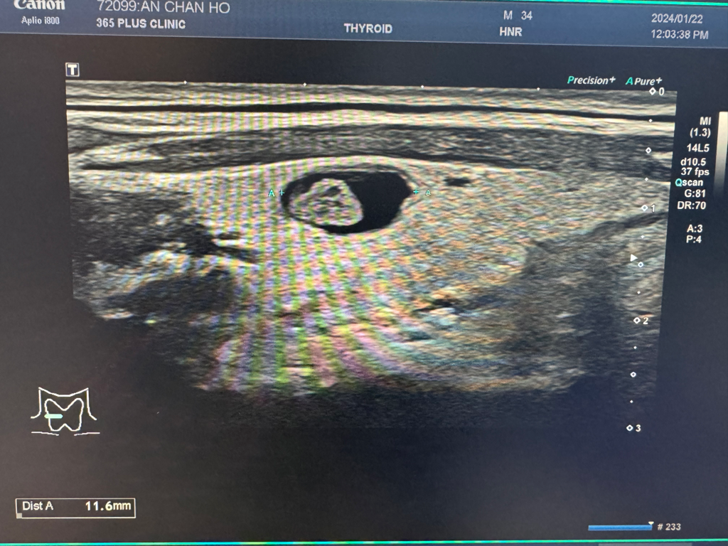 해당 병변은 낭성 결절에 고형 portion 이 함께 관찰되는 양상의 결절이며 악성이 의심되는 소견은 따로 보이기 때문에 KTIRAD 분류상 3정도 (Low suspicion) 에 해당하고 6~1년 간격의 경과관찰이 가능할 것으로 판단됩니다.