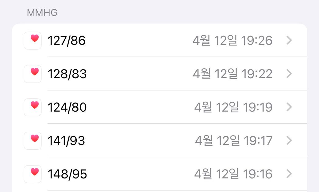 조금 움직이고 혈압 측정하니 148/95가 나왔습니다.너무 높게 나와서 좀 쉬고 측정하니 120대 중후반이 나왔습니다.